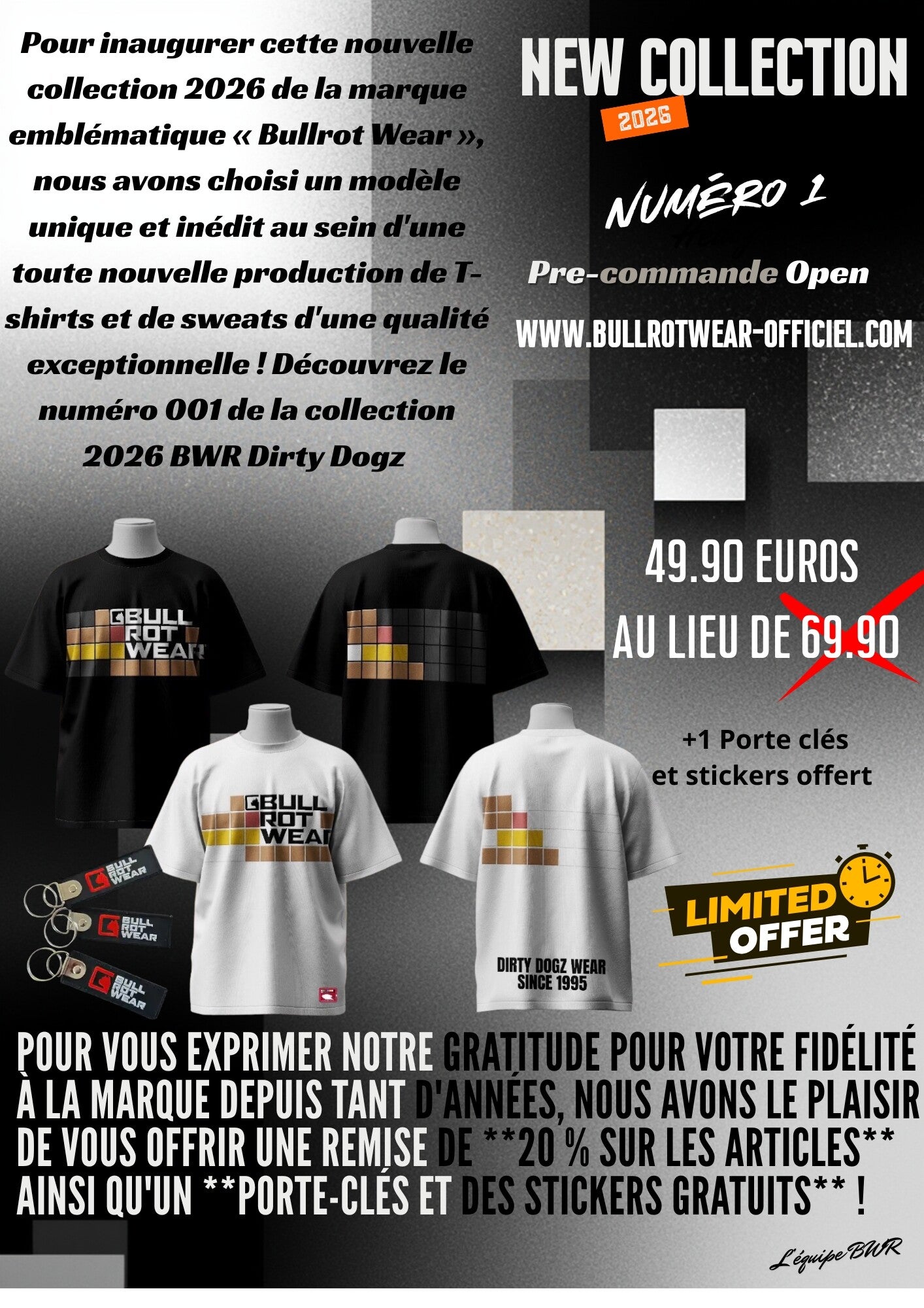 T-Shirt épais 300Gr de la nouvelle collection " Bullrot Wear " BWR Dirty Dogz Division Ultra Heavy Cotton Box oversize pour homme ou Femme Unisexe Streetwear 100% coton épais avec un col ras du cou et des épaules basses. La matière est en jersey simple.